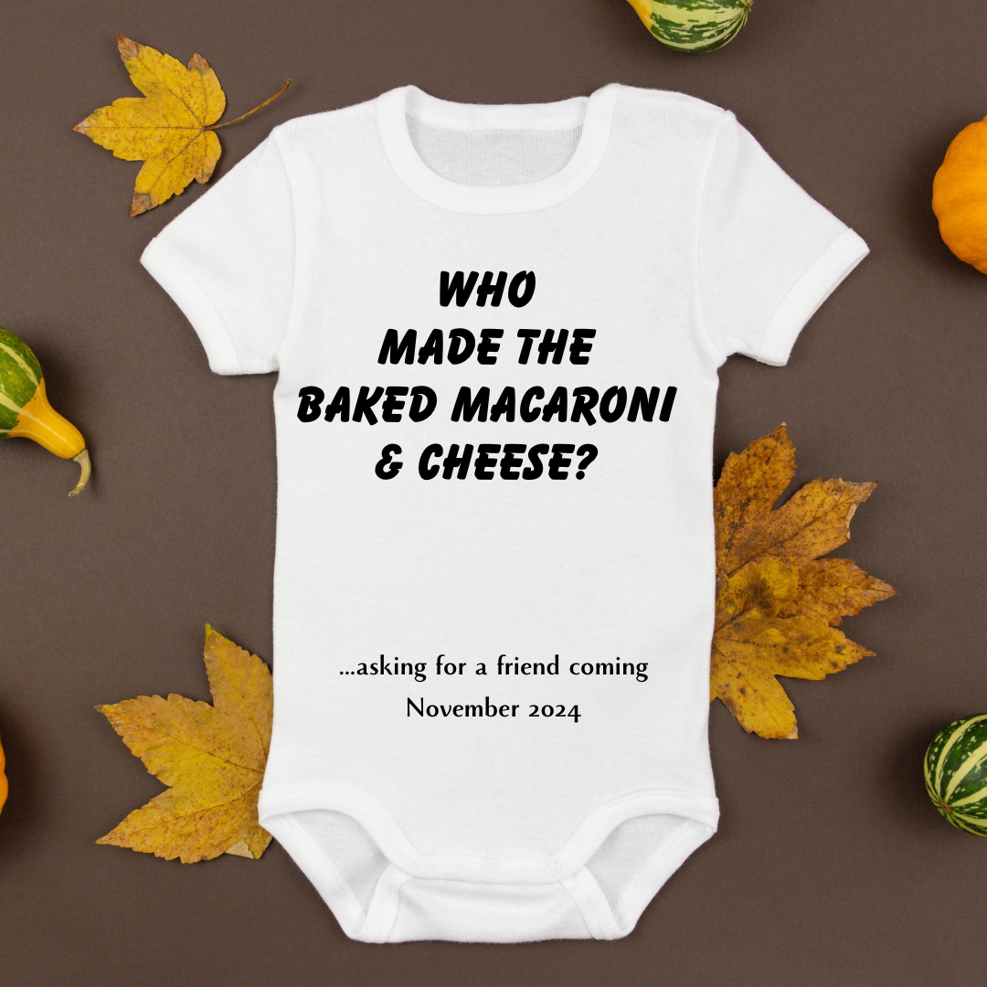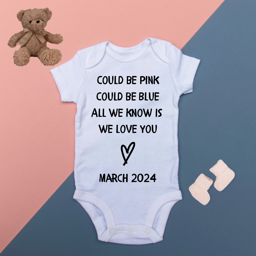Pregnancy announcement baby onesie for baby reveal keepsake. White onesie with the exact print design as displayed in photos (size will vary depending on availability)